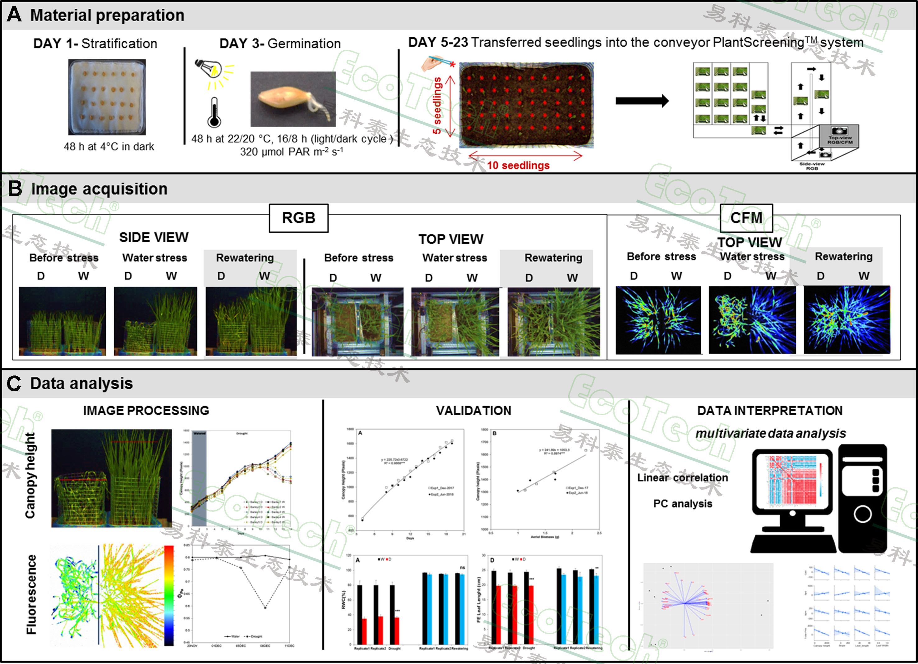 ·可與RGB成像形態(tài)結(jié)構(gòu)參數(shù)及FluorCam光合效率參數(shù)進行相關分析等;可完整記錄追溯干旱過程與復水過程的動態(tài)響應等