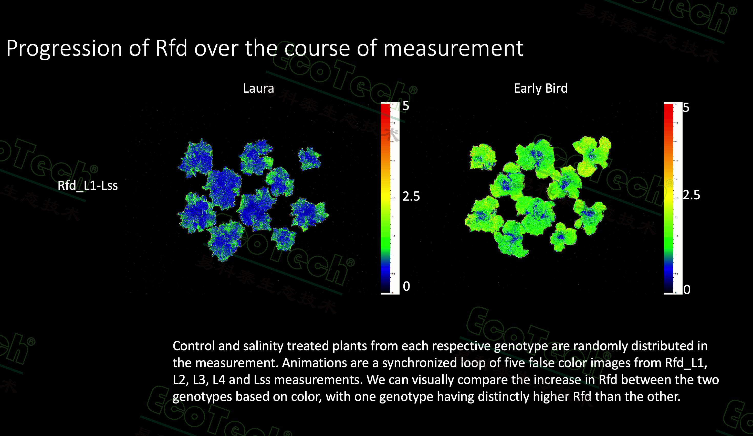 ·用于成像監(jiān)測分析植物水分狀態(tài)分布,具備假彩調(diào)色板,可以方便對比分析,快速監(jiān)測脫水植物,因而可以監(jiān)測評估干旱脅迫條件下植物水分的動態(tài)變化響應及水分利用效率等