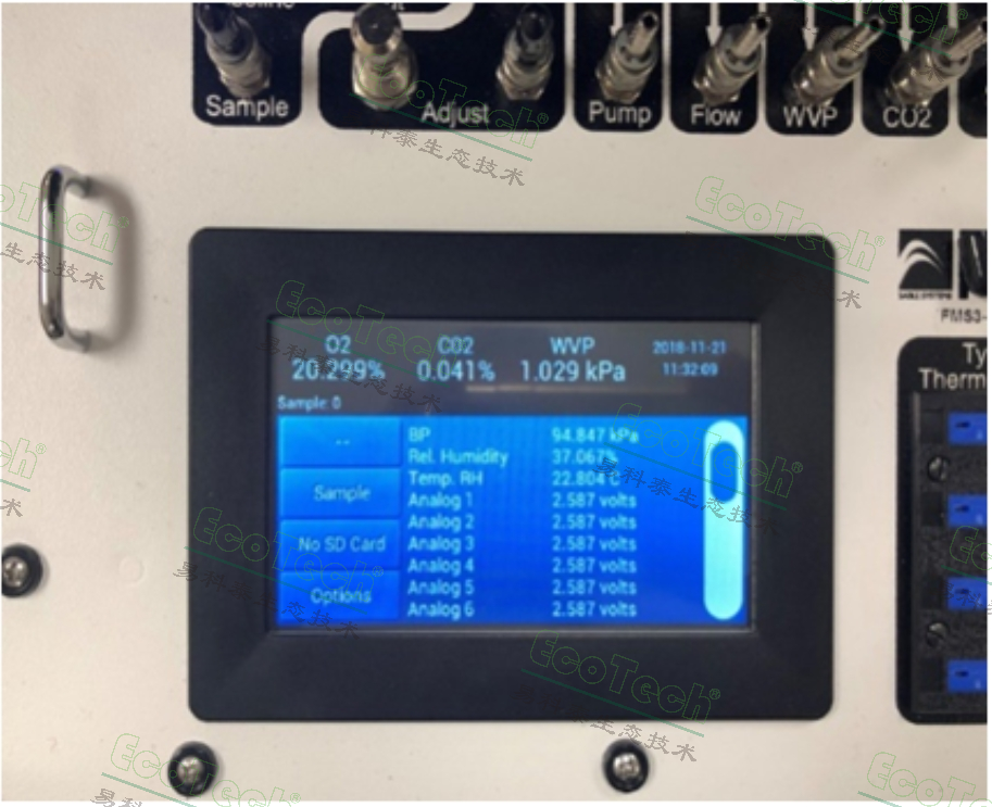15.觸摸屏操作,可實時顯示儀器各參數(shù),可同時顯示氧氣、二氧化碳、水汽壓、大氣壓、相對濕度、模擬輸入信號、儲存大小、取樣情況、日期時間序列等數(shù)據(jù)。配備Windows版本軟件,可在線顯示和分析數(shù)據(jù)