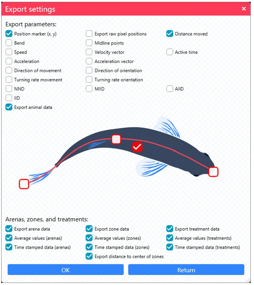 - 軟件可識別特定身體的點(diǎn)位(如尾、頭、中線中點(diǎn)、重心),跟蹤這些點(diǎn)用以研究運(yùn)動學(xué)(如擺尾頻率、身體擺動等)或者特定的行為(如身體取向、移動方向等)。
