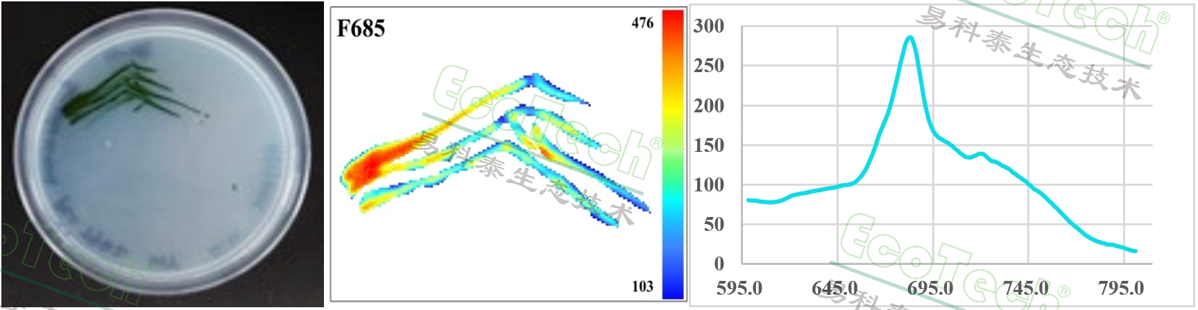 2) UV-MCF紫外光激發(fā)生物熒光高光譜成像分析,同步成像分析葉綠素熒光、藍綠熒光空間異質性分布及生物熒光光譜特征。其中藍綠熒光通常有藍色和綠色兩個峰值,由表皮、葉肉細胞壁和葉脈發(fā)出(指示次級代謝產物等);葉綠素熒光有F690紅色和F740遠紅兩個顯著的峰值,反映植物光合生理狀態(tài)。UV-MCF可以用來靈敏、特異性地評估植物生理狀態(tài)包括受脅迫狀態(tài)如干旱、病蟲害、環(huán)境污染、氮脅迫等