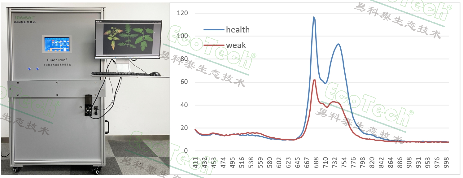 左圖:FluorTron?多功能高光譜成像分析系統(tǒng);右圖:番茄葉片葉綠素熒光成像