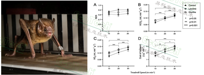 多倫多大學(xué)生理學(xué)家朱莉婭·羅西和加拿大麥克馬斯特大學(xué)肯尼思·韋爾奇從吸血蝙蝠經(jīng)常依靠奔跑來追蹤和捕獲獵物的觀察中找到靈感,通過FMS便攜式能量代謝測量儀和動(dòng)物跑步機(jī),以及采用同位素標(biāo)記的牛血食物來研究24只吸血蝙蝠的新陳代謝機(jī)制。通過讓蝙蝠以不同的速度(每分鐘10、20和 30米)在跑步機(jī)上奔跑,同時(shí)測量它們的新陳代謝率(耗氧量和二氧化碳產(chǎn)生量等指標(biāo),見下圖右)。