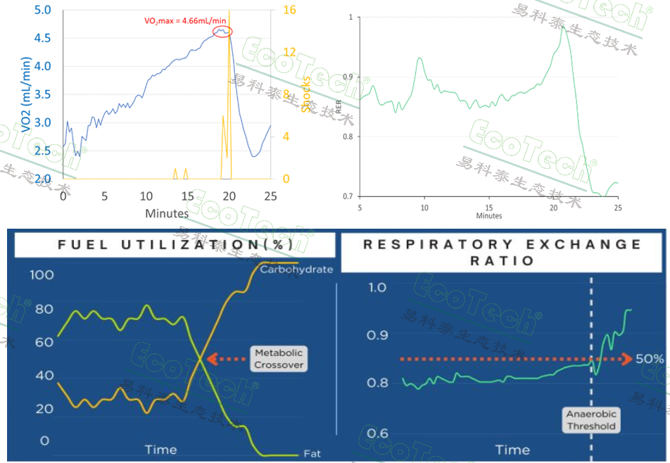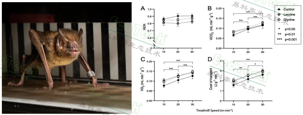多倫多大學生理學家朱莉婭·羅西和加拿大麥克馬斯特大學肯尼思·韋爾奇從吸血蝙蝠經(jīng)常依靠奔跑來追蹤和捕獲獵物的觀察中找到靈感,通過FMS便攜式能量代謝測量儀和動物跑步機,以及采用同位素標記的牛血食物來研究24只吸血蝙蝠的新陳代謝機制。通過讓蝙蝠以不同的速度(每分鐘10、20和 30米)在跑步機上奔跑,同時測量它們的新陳代謝率(耗氧量和二氧化碳產(chǎn)生量等指標,見下圖右)。