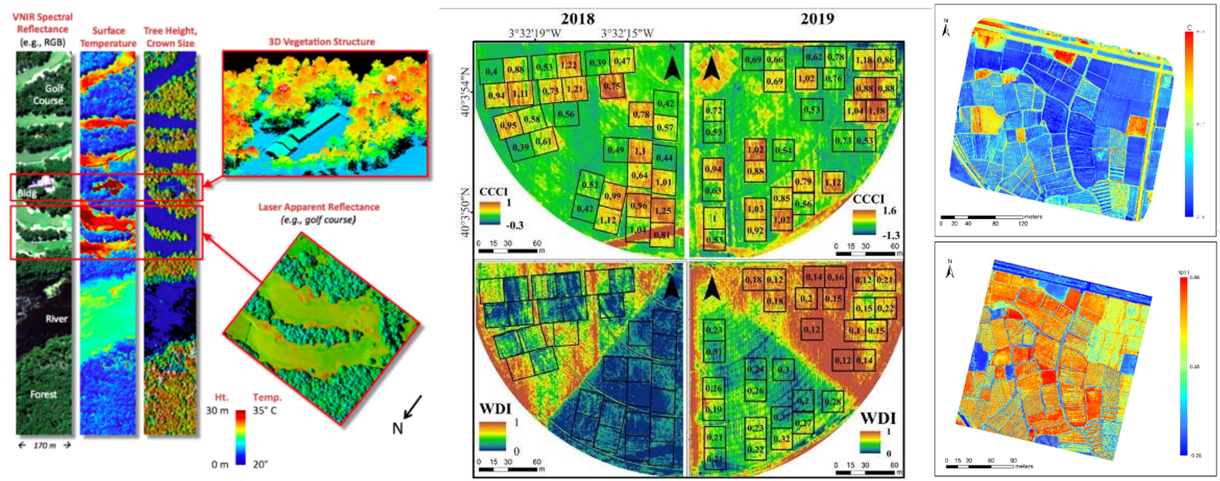 上左圖引自Bruce D. Cook等,NASA Goddard’s LiDAR, Hyperspectral and Thermal (G-LiHT) Airborne Imager, Remote Sensing 2013;上中圖引自Pancorbo J L ,Camino C , Alonso-Ayuso M , et al. Simultaneous assessment of nitrogen and water status in winter wheat using hyperspectral and thermal sensors[J]. European Journal of Agronomy, 2021, 127(3):126287.);上右圖為水稻田表型成像分析(易科泰光譜成像與無(wú)人機(jī)遙感研究中心提供)