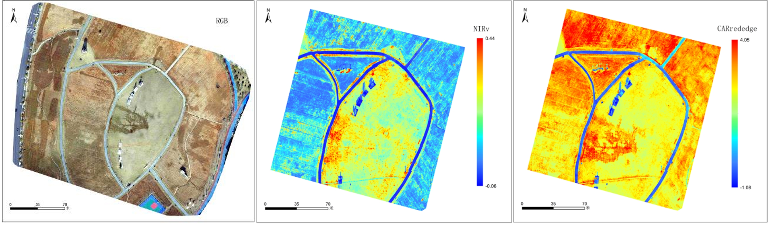 易科泰光譜成像與無(wú)人機(jī)遙感技術(shù)研究中心團(tuán)隊(duì)在某城市公園同步采集了高光譜、LiDAR、RGB及紅外熱成像等多傳感器遙感數(shù)據(jù),并進(jìn)行了分析。基于高光譜數(shù)據(jù)生成的植被指數(shù)可以定性和定量評(píng)價(jià)植被覆蓋及其生長(zhǎng)狀態(tài),如下圖NIRv歸一化差異植被指數(shù)可以評(píng)估植被覆蓋度,CARrededge可用于估算類胡蘿卜素與葉綠素比值。