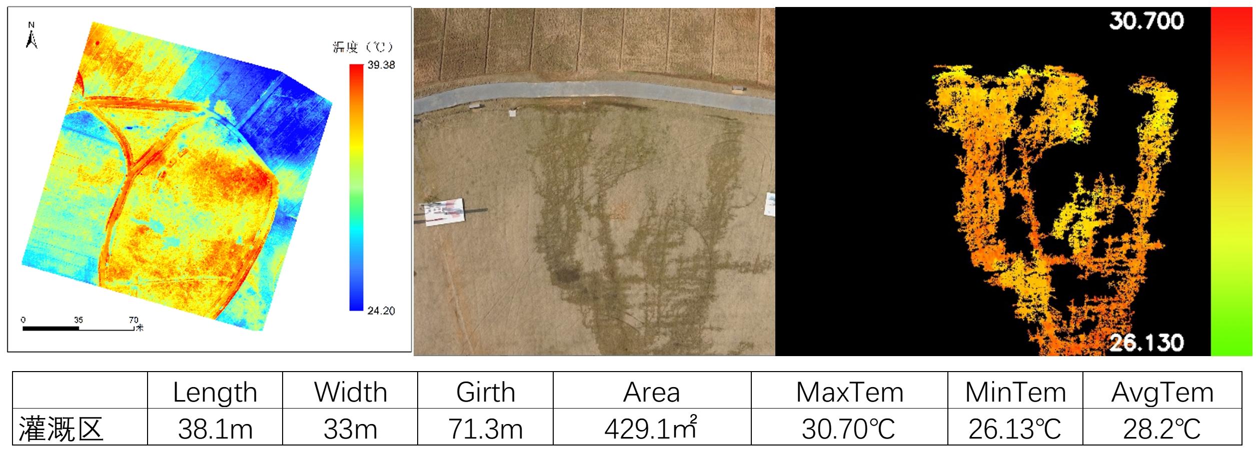 基于易科泰Thermo-RGB融合分析軟件,對(duì)草坪中灌溉區(qū)進(jìn)行可見(jiàn)光與紅外熱成像數(shù)據(jù)融合分析,如下圖為掩膜顯示結(jié)果,并統(tǒng)計(jì)其形狀、面積和溫度等信息,可以精確反映不同地物覆蓋情況及其溫度分布。