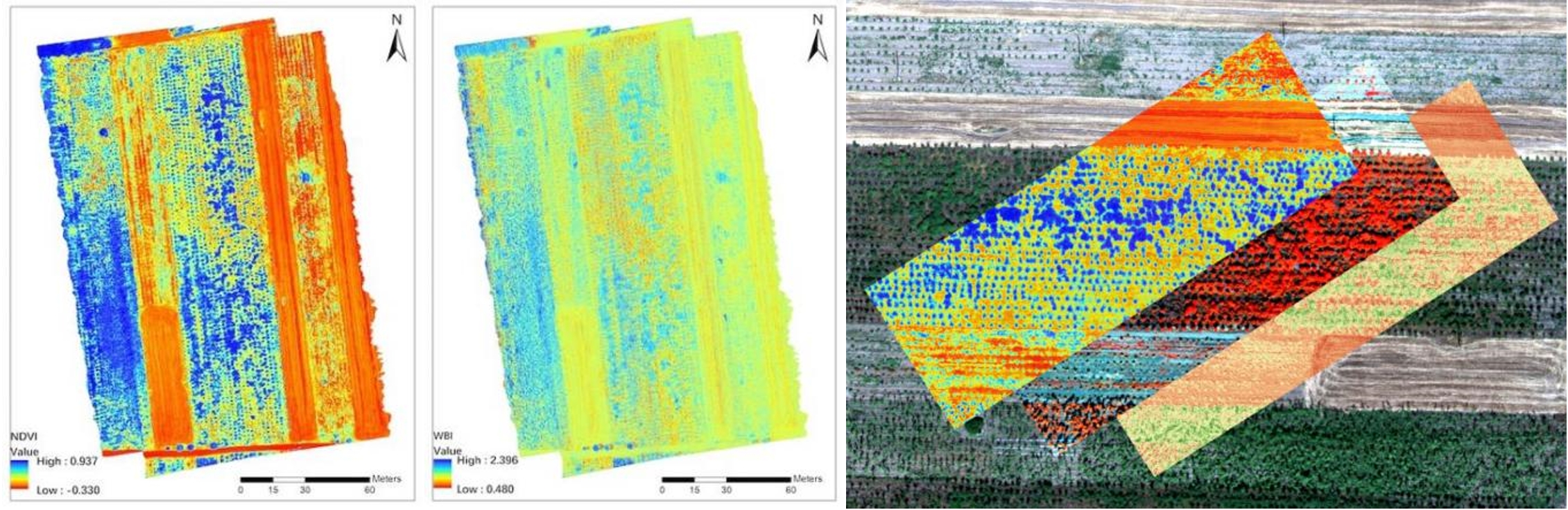 不同土地類型(人工林、新造人工林、收割后的麥田)高光譜數(shù)據(jù)處理結(jié)果,從左至右依次為歸一化植被指數(shù)、水波段指數(shù)、研究區(qū)專題圖疊加分析(背景底圖為RGB,從左至右依次為NDVI、NGB、PRI)