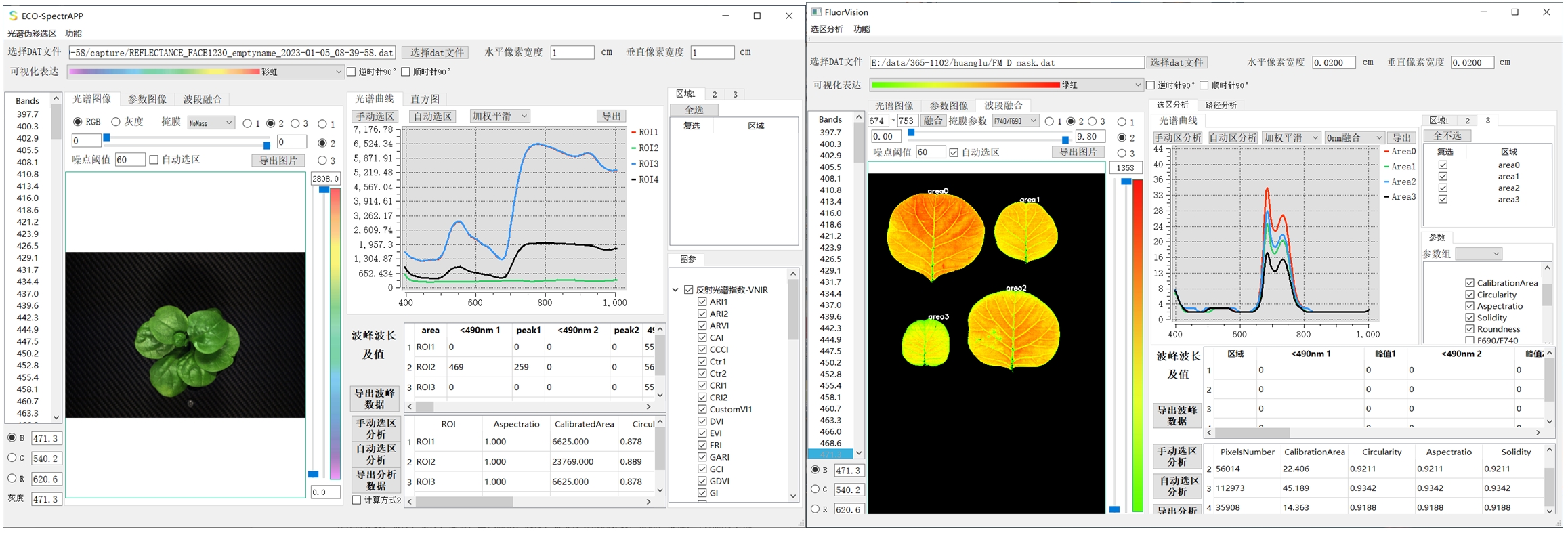 - SpectrAPP高光譜成像分析軟件及FluorVision高光譜熒光成像分析軟件,可進(jìn)行光譜融合、ROI選區(qū)分析、面積校準(zhǔn)、頻率直方圖、自動(dòng)識(shí)別不同波段峰值并分析其比值等,近百種參數(shù)一鍵分析