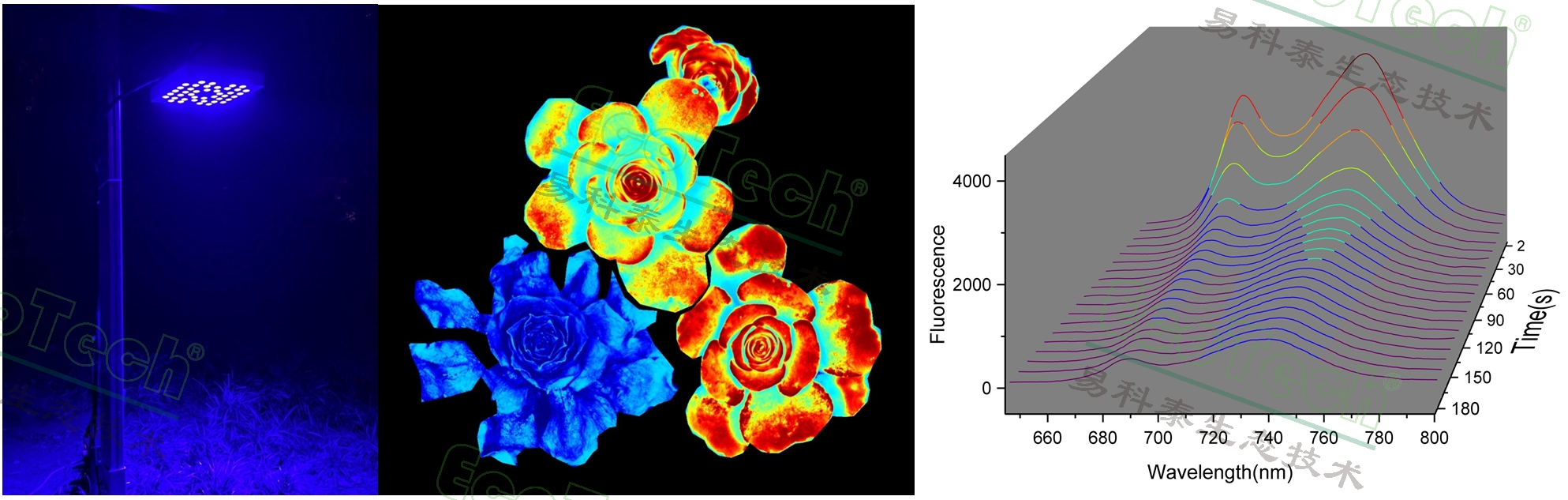 左圖FluorTron®葉綠素?zé)晒獬上翊筇锉O(jiān)測;中圖:葉綠素?zé)晒獬上?;右圖:葉綠素?zé)晒夤庾V動態(tài)(EcoTech®實驗室提供)