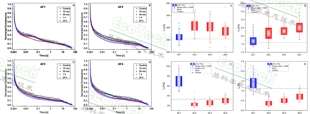 通過對(duì)Q-A再氧化動(dòng)力學(xué)在線監(jiān)測(cè),更詳細(xì)地理解電子傳遞過程以及PSII在不同環(huán)境條件下的動(dòng)態(tài)行為(參見下圖)。結(jié)果表明,AF涂層對(duì)Q-A再氧化動(dòng)力學(xué)有顯著影響,不同AF處理下動(dòng)力學(xué)曲線呈現(xiàn)出不同的模式。研究人員引入了特征時(shí)間常數(shù)(ti)這一概念進(jìn)一步分析Q-A再氧化動(dòng)力學(xué),將動(dòng)力學(xué)響應(yīng)曲線分為快相(phase)、中期相和慢相幾個(gè)階段,可以看出,含有最高除藻劑濃度的AF1組其特征時(shí)間常數(shù)(藍(lán)色柱)與其它組有非常大的差異,以上分析涵蓋了從微秒到秒級(jí)的時(shí)間尺度。