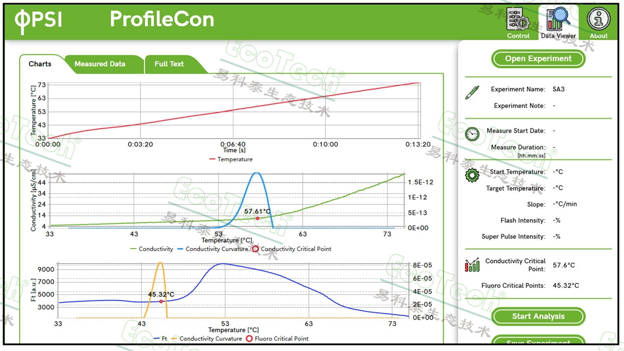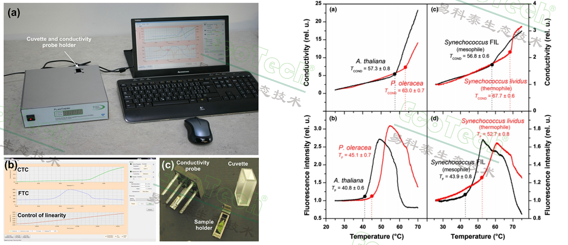 將植物樣品或微藻藻液加入到樣品杯中,然后加熱使溫度線性的從20℃升高到75℃(根據(jù)不同設(shè)置大約需要15-50分鐘),同時(shí)持續(xù)監(jiān)測(cè)樣品杯中電導(dǎo)的變化。通過(guò)獲得的電導(dǎo)/溫度曲線能夠計(jì)算出細(xì)胞中離子大量滲出的精確臨界溫度。這個(gè)臨界溫度可以衡量樣品細(xì)胞膜的熱耐受性與熱穩(wěn)定性。在加熱的過(guò)程中,儀器還會(huì)同步監(jiān)測(cè)樣品的葉綠素?zé)晒鈴?qiáng)度,葉綠素?zé)晒鈴?qiáng)度/溫度曲線用于評(píng)估光系統(tǒng)和光合電子傳遞鏈的熱耐受性與熱穩(wěn)定性。
