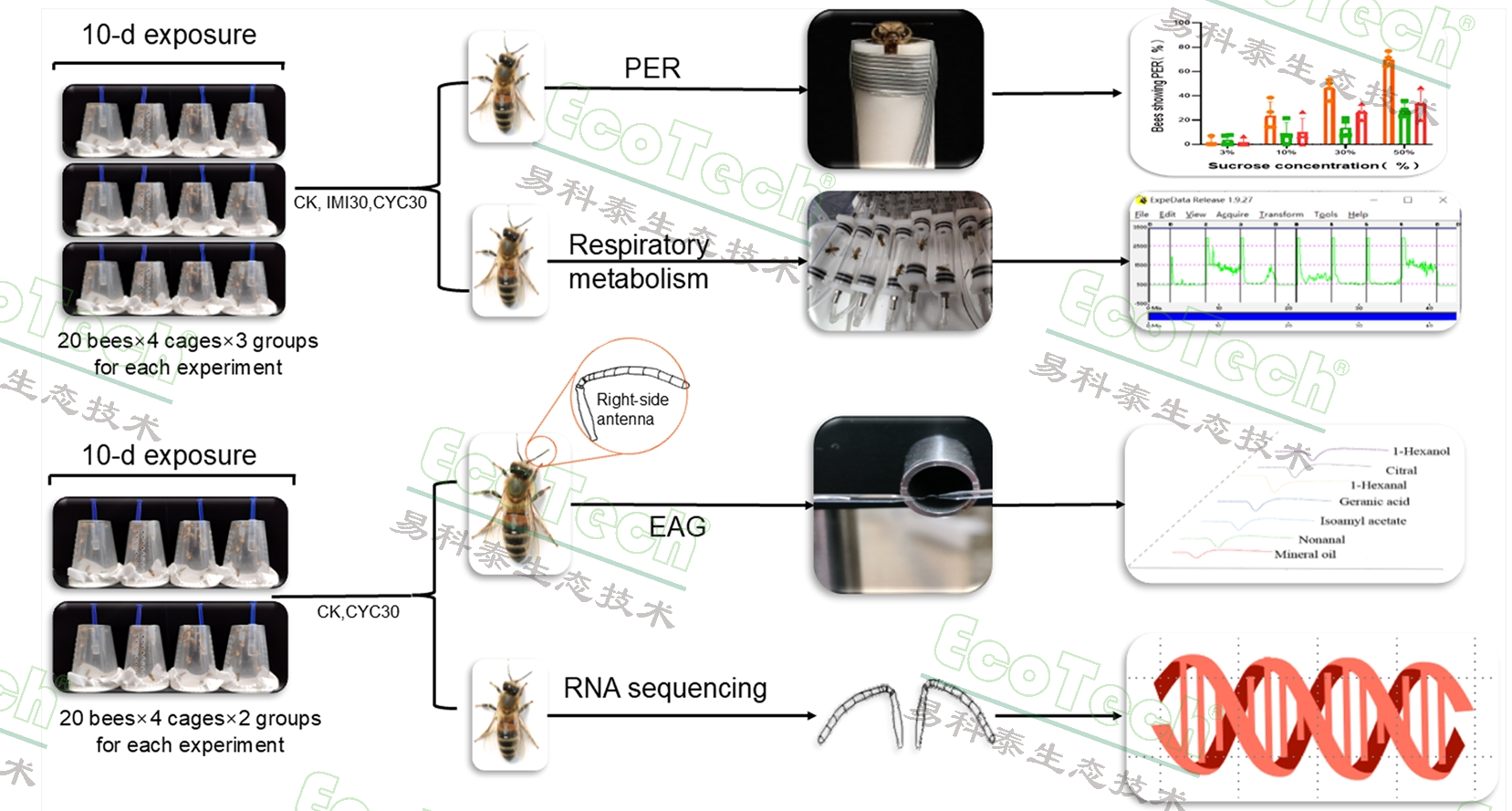 在慢性毒性實驗中,聯(lián)合團(tuán)隊使用北京易科泰生態(tài)技術(shù)有限公司提供的定制多通道昆蟲呼吸代謝測量系統(tǒng)進(jìn)行了單只蜜蜂的呼吸代謝實驗,并通過個體的二氧化碳排放速率作為藥物暴露后的呼吸代謝指標(biāo)。