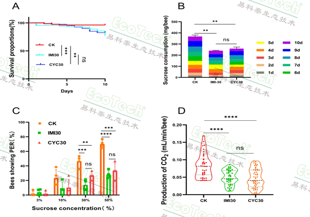 圖為長期接觸10天后環(huán)氧蟲啶對蜜蜂的毒性作用。CYC:環(huán)氧蟲啶;IMI:吡蟲啉,陽性對照化合物;A:生存暴露期間蜜蜂存活占比曲線;B:每只蜜蜂累計消耗50%蔗糖溶液;C:蜜蜂對不同濃度蔗糖溶液的響應(yīng)速率;D:CYC-或IMI處理后蜜蜂的呼吸代謝能力。