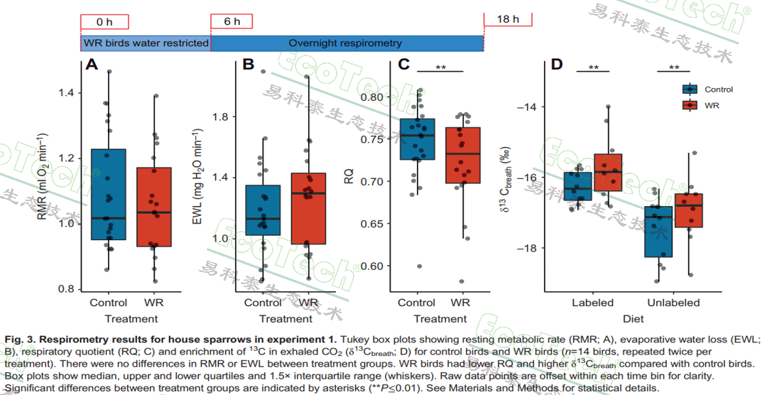 研究者給圈養(yǎng)的家麻雀喂食13C標(biāo)記的亮氨酸9周,以標(biāo)記內(nèi)源性蛋白質(zhì)。每周進(jìn)行一次試驗(yàn),在此期間,測(cè)量了對(duì)限水的生理反應(yīng),如瘦體重、脂肪量、新陳代謝的變化以及呼出二氧化碳中13C 的富集(δ13Cbreath)。研究發(fā)現(xiàn),限水的鳥(niǎo)類(lèi)分解代謝了更多的瘦肉組織,并且還富集了δ13Cbreath以響應(yīng)限水。然而,δ13Cbreath隨代謝率和限水期的長(zhǎng)短而變化,這表明當(dāng)可以使用其它生理策略實(shí)現(xiàn)水分平衡時(shí),鳥(niǎo)類(lèi)可能會(huì)節(jié)省蛋白質(zhì)。