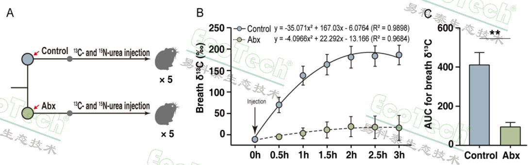 圖A)實(shí)驗(yàn)設(shè)計(jì)示意圖(每組n=5只鼠兔);(B)13C-尿素示蹤的Abx鼠兔和對(duì)照鼠兔的平均呼氣δ13C,箭頭表示腹膜內(nèi)注射13C-尿素;(C)根據(jù)(B)中的呼吸δ13C數(shù)據(jù)計(jì)算的曲線面積(AUC)。