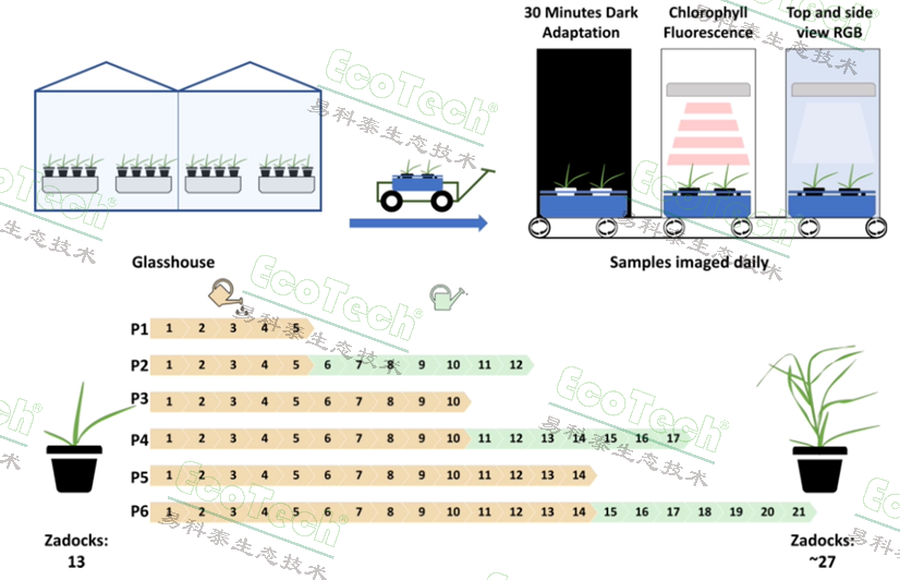 每種處理(P1–P6)均對兩個基因型(RGT Planet 與 Glasnevin no.5)設(shè)置5個重復(fù),按圖中所示的水淹時間(橙色)與恢復(fù)時間(綠色)進行處理;另設(shè)同等數(shù)量、植株大小一致的對照,保持正常澆水,采用裂區(qū)設(shè)計(以水分處理為主區(qū)、品種為副區(qū))。所有植株在破壞性取樣前每日進行圖像采集。