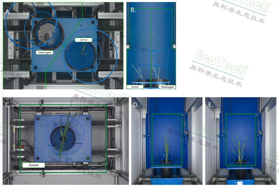 A、B為都柏林大學(xué)實驗1的俯視與側(cè)視示意圖,脅迫第4天使用PlantScreen™系統(tǒng)采集的 RGT Planet品種的圖像;綠色線標(biāo)示單株分割區(qū)域,圖中藍色支架用于防止葉片越界。C、D、E為亞眠大學(xué)實驗2 的俯視與 0°、90°雙側(cè)視配置,綠色線對應(yīng)RGB成像室單次拍攝的分割邊界,示例為第14天對照植株。每次灌溉與拍攝后,所有培養(yǎng)盆均返回生長室內(nèi)預(yù)設(shè)固定位置。