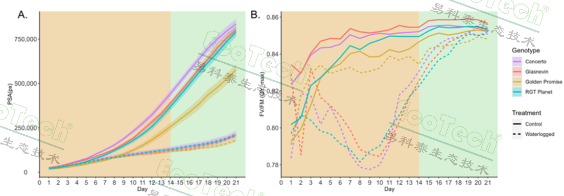 本研究通過圖像表型分析方法,確定了一個最佳的水淹脅迫實驗方案(14天脅迫加7天恢復(fù)),該方案能夠顯著區(qū)分不同大麥品種對水淹脅迫的響應(yīng)。研究結(jié)果表明,水淹脅迫顯著降低了大麥的生物量和光合性能,并且通過綠色度分析可以觀察到植物對脅迫的適應(yīng)和恢復(fù)能力。此外,本研究還強調(diào)了在脅迫后包括恢復(fù)期的重要性,因為這有助于觀察植物在脅迫后的生長恢復(fù)情況。通過高通量圖像表型分析,本研究提供了一種新的、可重復(fù)的評估大麥早期水淹耐受性的方法,有助于更精確地量化與水淹脅迫相關(guān)的標(biāo)記,如綠色度、Fv/Fm和PSA。