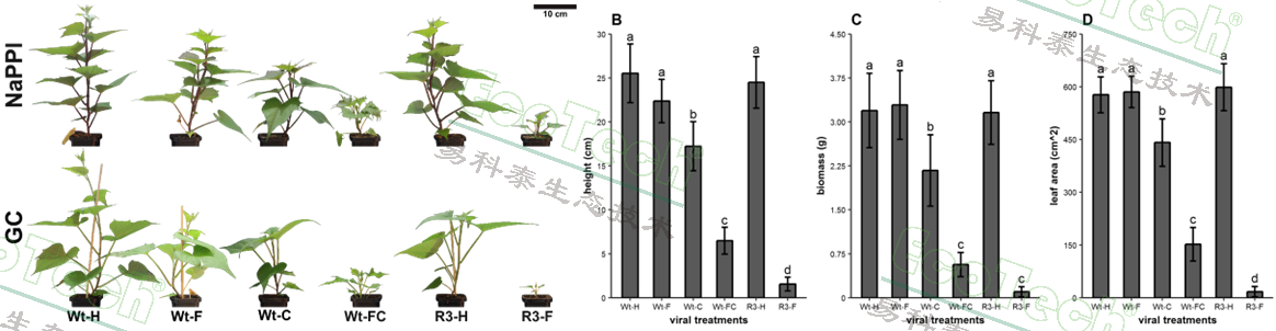 結(jié)果表明,與健康植株(Wt-H)和僅感染SPFMV(Wt-F)的植株相比,感染SPCSV(Wt-C)、共感染(Wt-FC)以及轉(zhuǎn)基因感染(R3-F)的植株生長受到顯著抑制,表現(xiàn)為株高降低、生物量和葉面積減少。