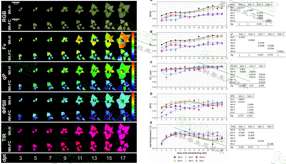 葉綠素?zé)晒鈪?shù)ΦPSII(PSII有效量子產(chǎn)量)和 qP(光化學(xué)淬滅系數(shù))是區(qū)分不同病毒處理嚴(yán)重程度的最敏感參數(shù),在感染第3天即可明顯指示病害發(fā)生。癥狀嚴(yán)重的植株(Wt-FC,R3-F)這兩個值均顯著降低,表明其光化學(xué)反應(yīng)中心效率低下。葉片溫度在癥狀嚴(yán)重的植株中更高,這可能是由于氣孔關(guān)閉導(dǎo)致蒸騰作用減少所致。TIR成像在感染早期(約7天后)就能檢測到溫度差異。