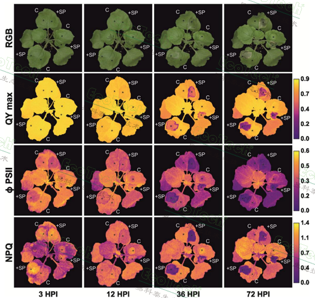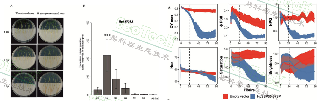 左圖:接種病菌的云杉根部和HpSSP35.8的表達動力學(xué);右圖:本氏煙葉片的葉綠素?zé)晒馀cRGB彩色成像參數(shù)動態(tài)變化,葉綠素?zé)晒鈪?shù)包括QYmax、ΦPSII和NPQ,RGB彩色成像圖轉(zhuǎn)化為色調(diào)飽和度數(shù)據(jù)(Hue-Saturation-Brightness)
