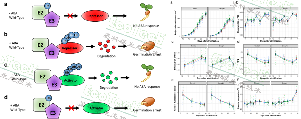 左:泛素E3連接酶在ABA反應(yīng)途徑中的功能假說;右:對應(yīng)處理的冠層投影面積、各項葉綠素?zé)晒鈪?shù)、冠層溫度的動態(tài)曲線