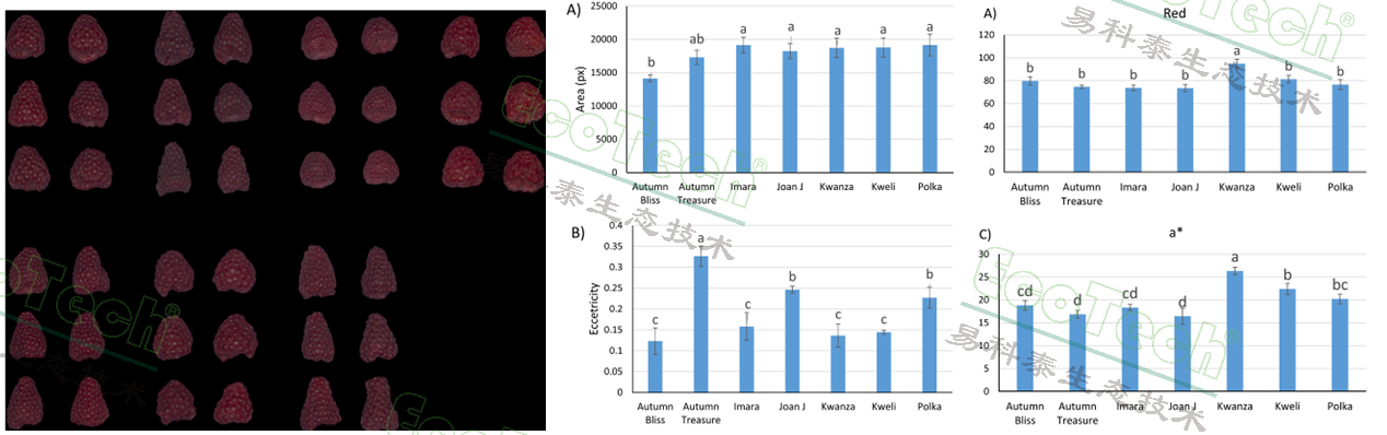 左圖:經(jīng)過背景去除的樹莓果實RGB成像圖;中圖:樹莓果實的形態(tài)數(shù)據(jù):面積和偏心率;右圖:樹莓果實的顏色數(shù)據(jù):平均紅度和CIE數(shù)值