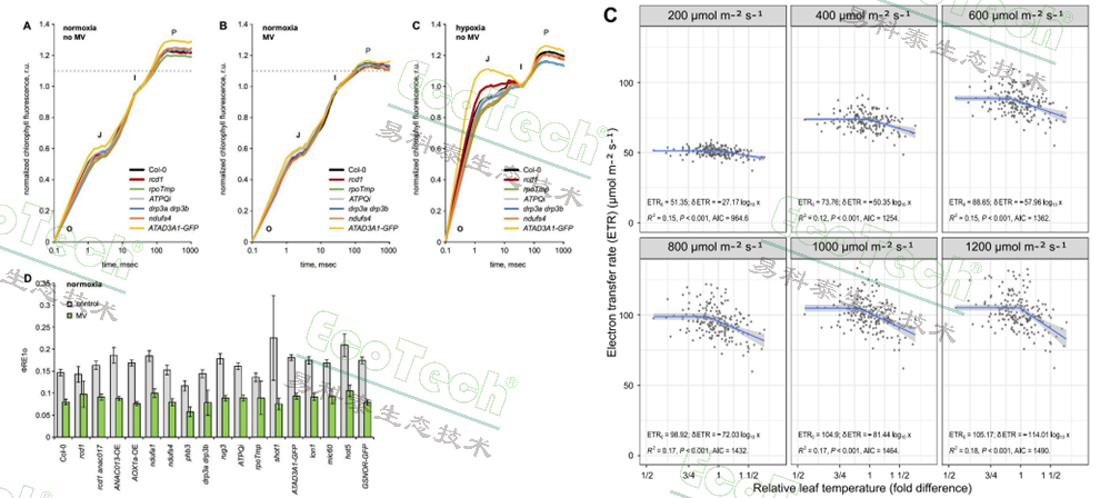 左圖:擬南芥在正常含氧量環(huán)境與缺氧環(huán)境下添加或不添加百草枯(MV)的OJIP曲線與φRE1o(PSI電子受體的電子流量子產(chǎn)額)數(shù)據(jù)圖(Punkkinen,2025);右圖:蠶豆不同光照條件下相對葉溫與電子傳遞速率ETR的相關(guān)性(Shapiguzov,2025)