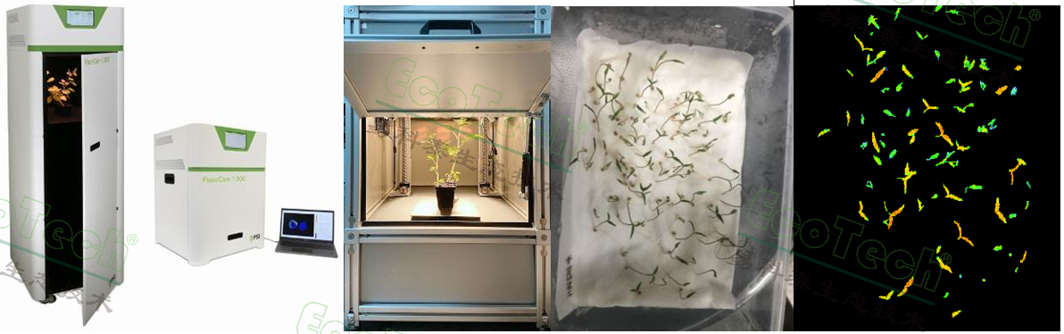 左圖:新一代FluorCam1300多激發(fā)光多光譜熒光成像系統(tǒng);中:FluorTron®植物光合表型成像分析系統(tǒng);右:利用易科泰葉綠素?zé)晒獬上窦夹g(shù)測量番茄種子萌發(fā)率并評估種苗活力