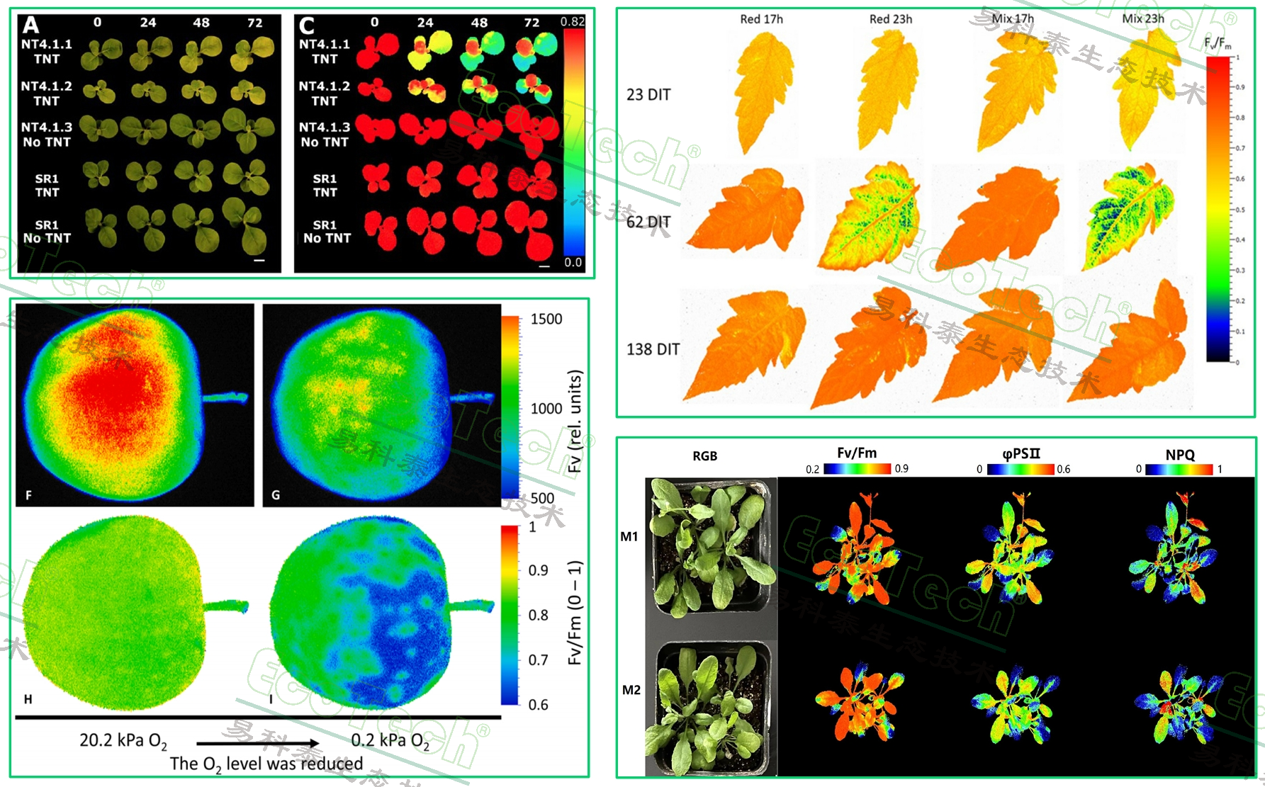 葉綠素熒光不僅能反映光能吸收、激發(fā)能傳遞和光化學反應等光合作用的原初反應過程,而且與電子傳遞、質(zhì)子梯度的建立及ATP合成和CO2固定等過程有關(guān)。是研究光合作用的探針。通過葉綠素熒光測量技術(shù),可以快速、靈敏、準確地獲得眾多葉綠素熒光參數(shù),這些參數(shù)反映植物、藻類等測量目標的光合效率。而葉綠素熒光成像則將葉綠素熒光測量代入二維成像時代。該技術(shù)已經(jīng)大量應用于植物、藻類研究的各個領(lǐng)域,包括表型組學、遺傳育種、病蟲害、脅迫檢測、光合生理研究、基因功能鑒定、突變體篩選、園藝研究等。