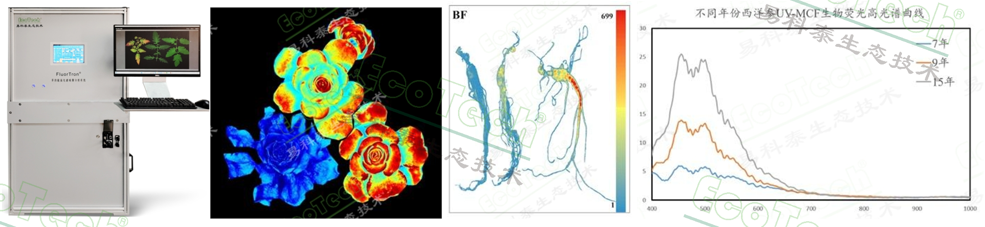 左圖:番茄光合作用損傷實驗(EcoTech®實驗室提供);右圖:機(jī)器視覺多光譜熒光成像檢測氣候變化條件下油菜黑腐病,F520為多光譜熒光成像綠色熒光(引自:Monica Pineda and Matilde Baron, 2023. Assessment of Black Rot in Oilseed Rape Grown under Climate Change Conditions Using Biochemical Methods and Computer Vision)