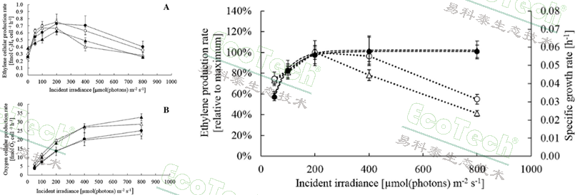 左圖,兩種集胞藻乙烯 (圖A) 和氧氣 (圖B) 產(chǎn)率與光照強度之間的關系;右圖,集胞藻在不同光照條件下的乙烯產(chǎn)率和生長速率