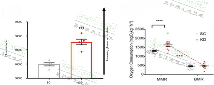 圖左:斑馬魚胚胎階段以2D6P攝取評估代謝率;圖右:成年后斑馬魚的最大氧氣消耗率(MMR)和基礎(chǔ)代謝率(BMR)