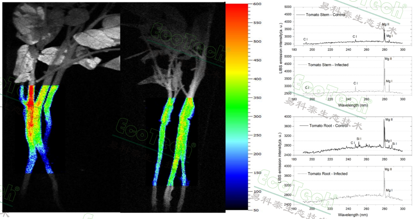 圖2. 左圖:感染根結(jié)線蟲的番茄莖葉綠素?zé)晒獬上駥?duì)比圖;右圖:感染根結(jié)線蟲的番茄莖和根的LIBS元素對(duì)比光譜