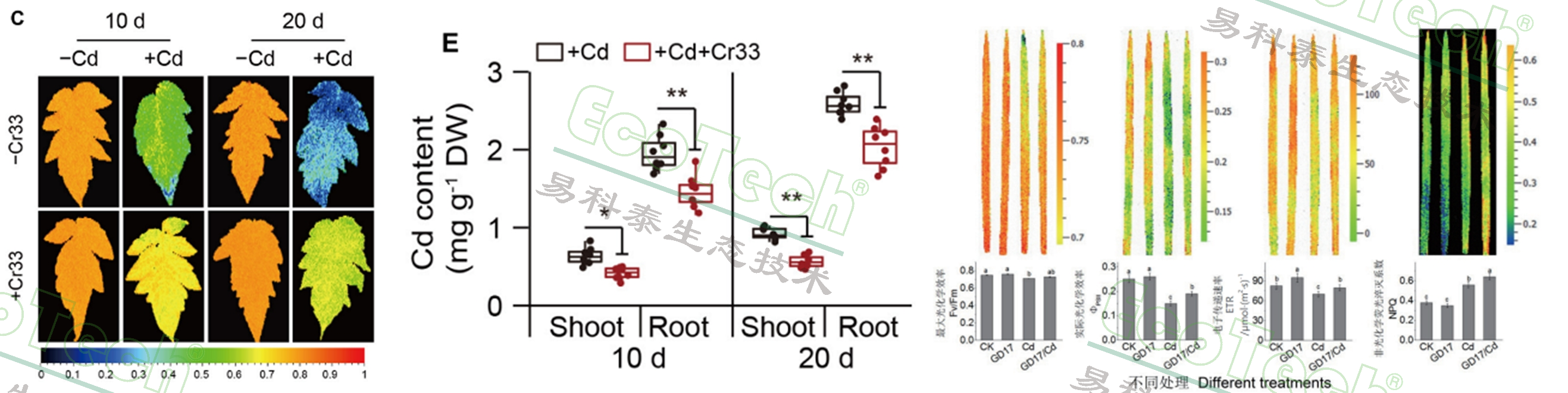 除了直接改良土壤外,利用根際內(nèi)生菌直接調(diào)節(jié)植物對重金屬的吸收和積累也是重要的研究方向之一。安徽科技大學(xué)與南京農(nóng)業(yè)大學(xué)合作研究發(fā)現(xiàn),根際內(nèi)生菌Lysinibacillus fusiformis Cr33顯著降低了番茄植株鎘(Cd)積累。FluorCam葉綠素?zé)晒獬上窠Y(jié)果表明隨Cd濃度降低,番茄葉片光合系統(tǒng)的損傷程度也顯著降低,證明了根內(nèi)生菌對地上部的保護作用。沈陽師范大學(xué)則利用FluorCam葉綠素?zé)晒獬上褡C明了根內(nèi)生菌Burkholderia sp. GD17 在水稻對Cd脅迫應(yīng)答中,對光合系統(tǒng)具有顯著的保護性影響,減少了Cd損傷造成最大光化學(xué)效率Fv/Fm、實際光化學(xué)效率ΦPSII、電子傳遞速率ETR的降低。