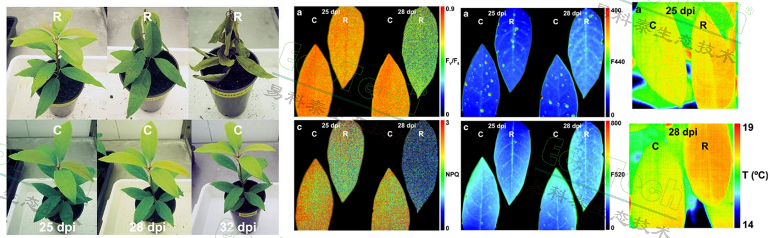 白紋羽病Rosellinia necatrix是鱷梨最重要的土壤傳播疾病之一。西班牙高等學(xué)術(shù)研究委員會利用FluorCam多光譜熒光成像技術(shù)及紅外熱成像技術(shù)對根系感染后的鱷梨葉片的進行了葉綠素?zé)晒獬上?、多光譜熒光成像和熱成像分析,發(fā)現(xiàn)病害造成的根系功能損失,能夠同步影響葉片的光合生理、次生代謝和氣孔功能。而葉綠素?zé)晒鈪?shù)甚至可以在癥狀發(fā)展前就指示出病害的發(fā)生。通過FluorCam多光譜熒光成像技術(shù)進行的這一研究既發(fā)現(xiàn)了根系病害對植物整體生理功能和地上部表型的影響,也為根系病害提供了早期檢測工具。