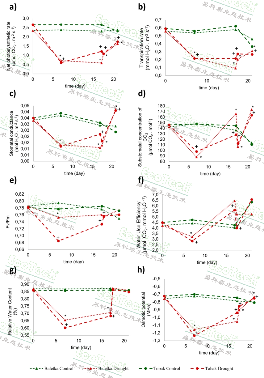在研究中,通過便攜式光合作用測量系統(tǒng)測定的光合參數(shù),揭示了兩種小麥品種Baletka和Tobak在干旱和恢復(fù)期間的水分利用和光合能力的顯著差異。