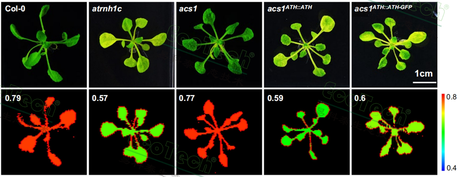 研究中對(duì)atrnh1c進(jìn)行EMS誘變篩選出多個(gè)突變體,利用Fluorcam葉綠素?zé)晒獬上竦燃夹g(shù)對(duì)他們進(jìn)行了表型鑒定,其中acs1(atrnh1c抑制突變體)的Fv/Fm相比atrnh1c明顯升高。其他方法的鑒定結(jié)果共同說(shuō)明了acs1恢復(fù)了擬南芥的基因穩(wěn)定性。