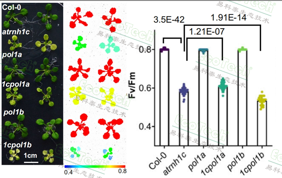 葉綠體基因組的復(fù)制需要兩種DNA聚合酶的參與,即Pol1A和Pol1B。先前的研究表明,Pol1B不僅參與復(fù)制過(guò)程,還具有DNA修復(fù)功能。Fluorcam成像等鑒定結(jié)果表明,Pol1B和atrnh1c的雙突變體(1cpol1b)表現(xiàn)出比atrnh1c更嚴(yán)重的葉綠體基因組退化和生長(zhǎng)缺陷。Pol1A和atrnh1c的雙突變體(1cpol1a),與atrnh1c相比,生長(zhǎng)缺陷、光合效率Fv/Fm、葉綠素含量以及每細(xì)胞葉綠體數(shù)量部分恢復(fù)PolIA功能缺失可減少TRCs,維持基因組穩(wěn)定性。