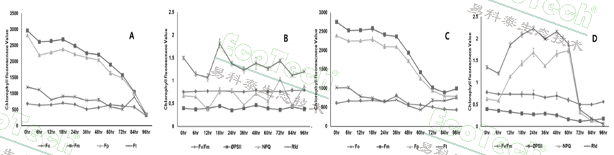 生長 96 小時(shí)的玉米幼苗的葉綠素?zé)晒獬上駞?shù)變化的比較。對 Fo、Fm、Fp 和 Ft(3A 和 C)以及 Fv/Fm、ΦPSII、NPQ 和 Rfd(3B 和 D)的比較分析。