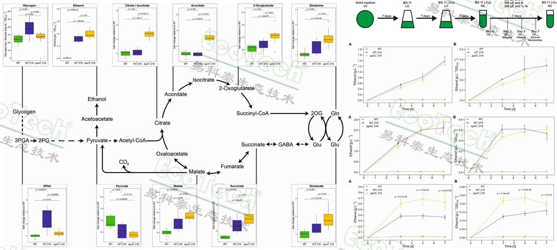 德國(guó)Böhm J團(tuán)隊(duì)(Frontiers in microbiology, 2023)通過(guò)構(gòu)建攜帶pirC基因突變的產(chǎn)乙醇藍(lán)藻菌株,利用MC1000多通道藻類培養(yǎng)監(jiān)測(cè)系統(tǒng)模擬不同光照條件及低氧低氮環(huán)境,探究了不同氮、碳水平下pirC突變對(duì)乙醇產(chǎn)量的影響,并分析了該突變對(duì)藍(lán)藻碳分配(如糖原儲(chǔ)存、糖酵解途徑)及整體初級(jí)代謝的調(diào)控作用。實(shí)驗(yàn)結(jié)果顯示:在氮限制條件下,2-酮戊二酸的積累促使pirC從與PII蛋白的結(jié)合態(tài)中釋放,進(jìn)而抑制磷酸甘油酸變位酶;而pirC的缺失可解除這一抑制效應(yīng),增加丙酮酸供應(yīng),最終提升乙醇產(chǎn)量;在正常氮條件下,糖原儲(chǔ)存是碳分配的主要方向,從而削弱了pirC突變的作用。該研究證實(shí),pirC介導(dǎo)的碳通量調(diào)控是藍(lán)藻乙醇生產(chǎn)的關(guān)鍵靶點(diǎn),為構(gòu)建高效產(chǎn)乙醇藍(lán)藻“綠色細(xì)胞工廠”提供了理論依據(jù)與技術(shù)參考。